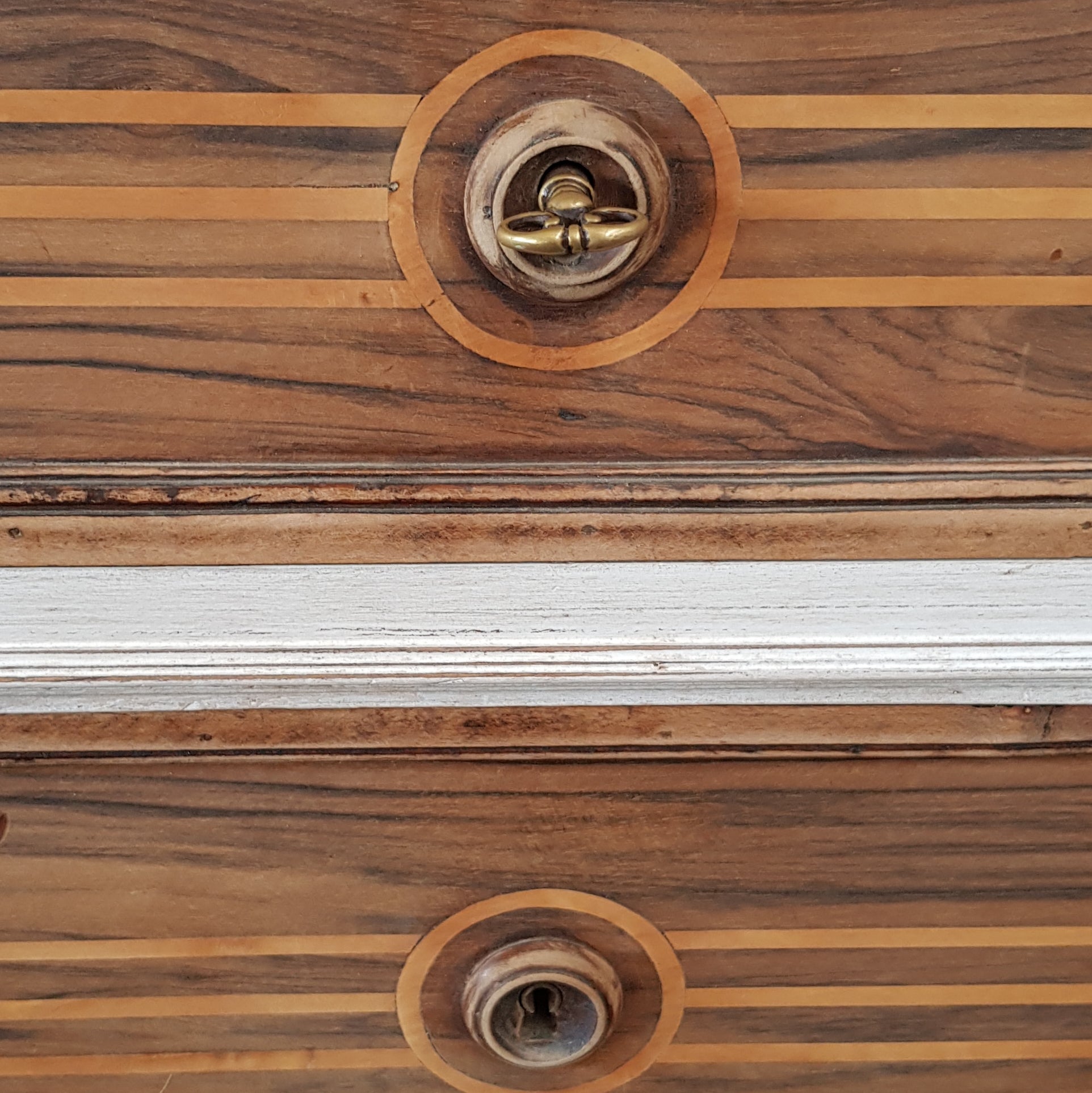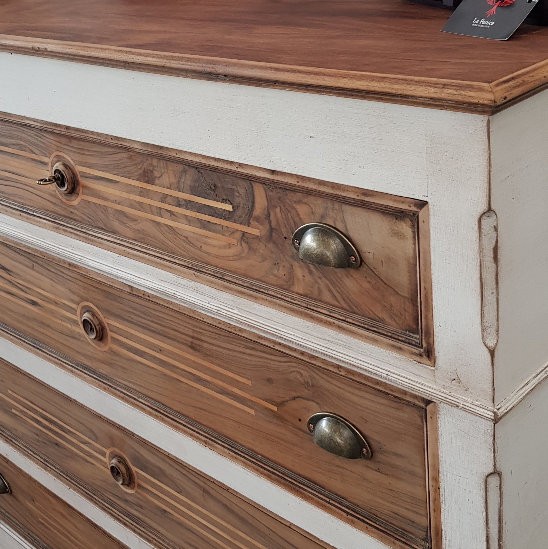 Colore bianco decapè e legno, maniglie bronzate.