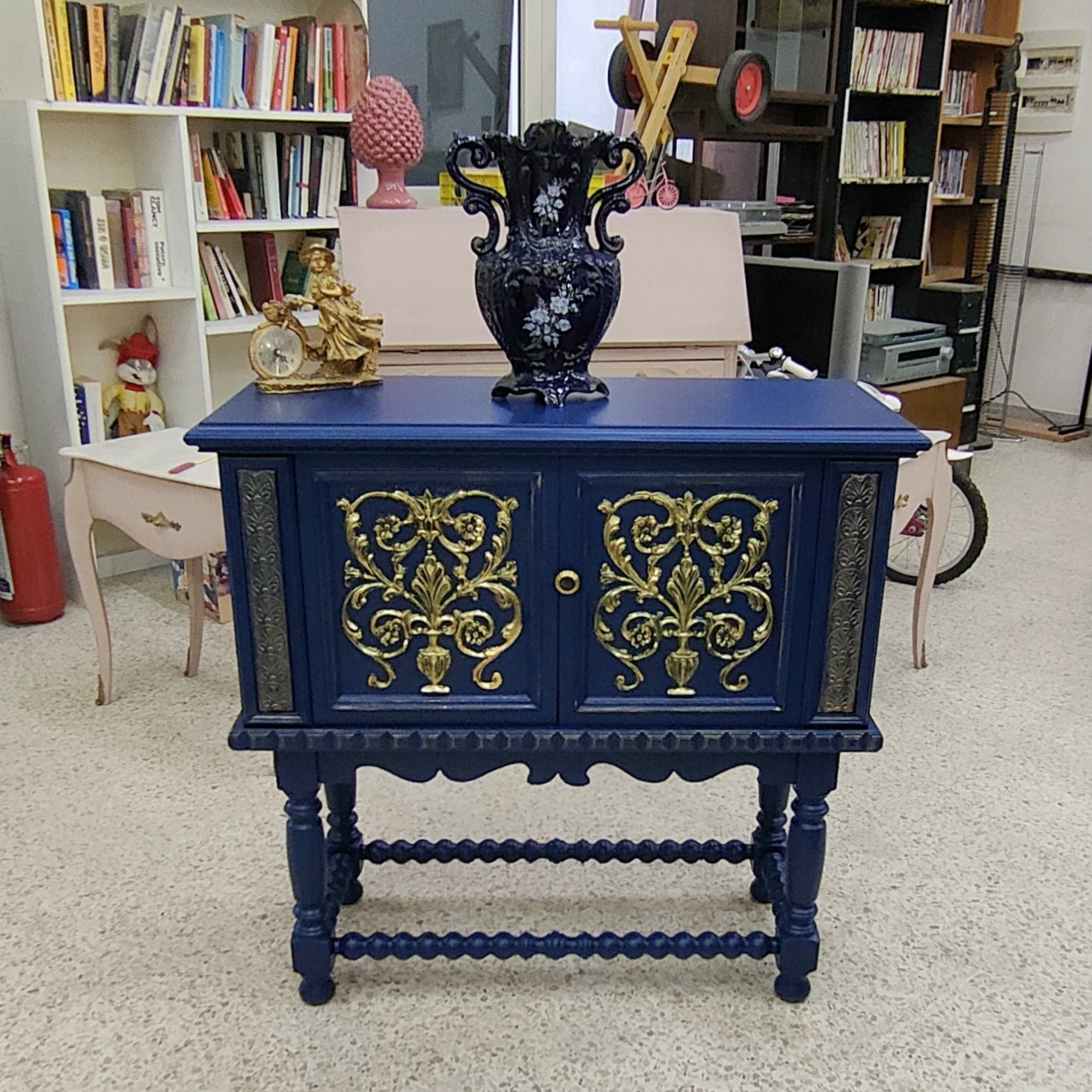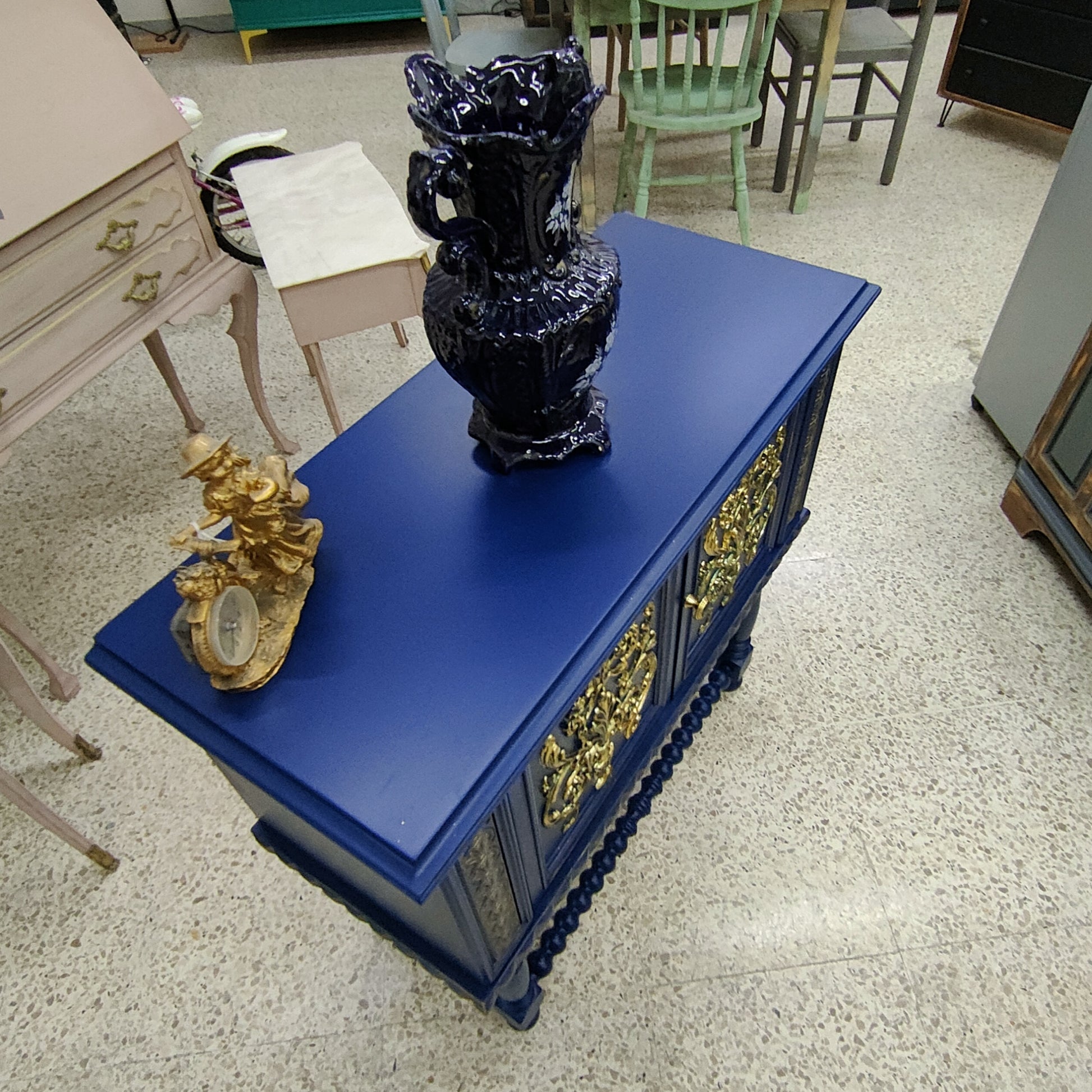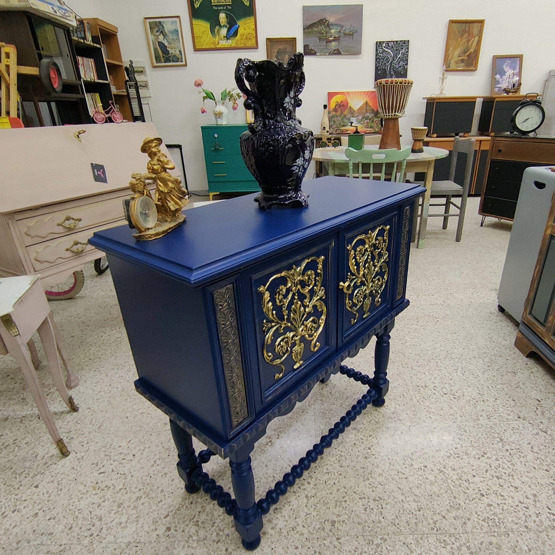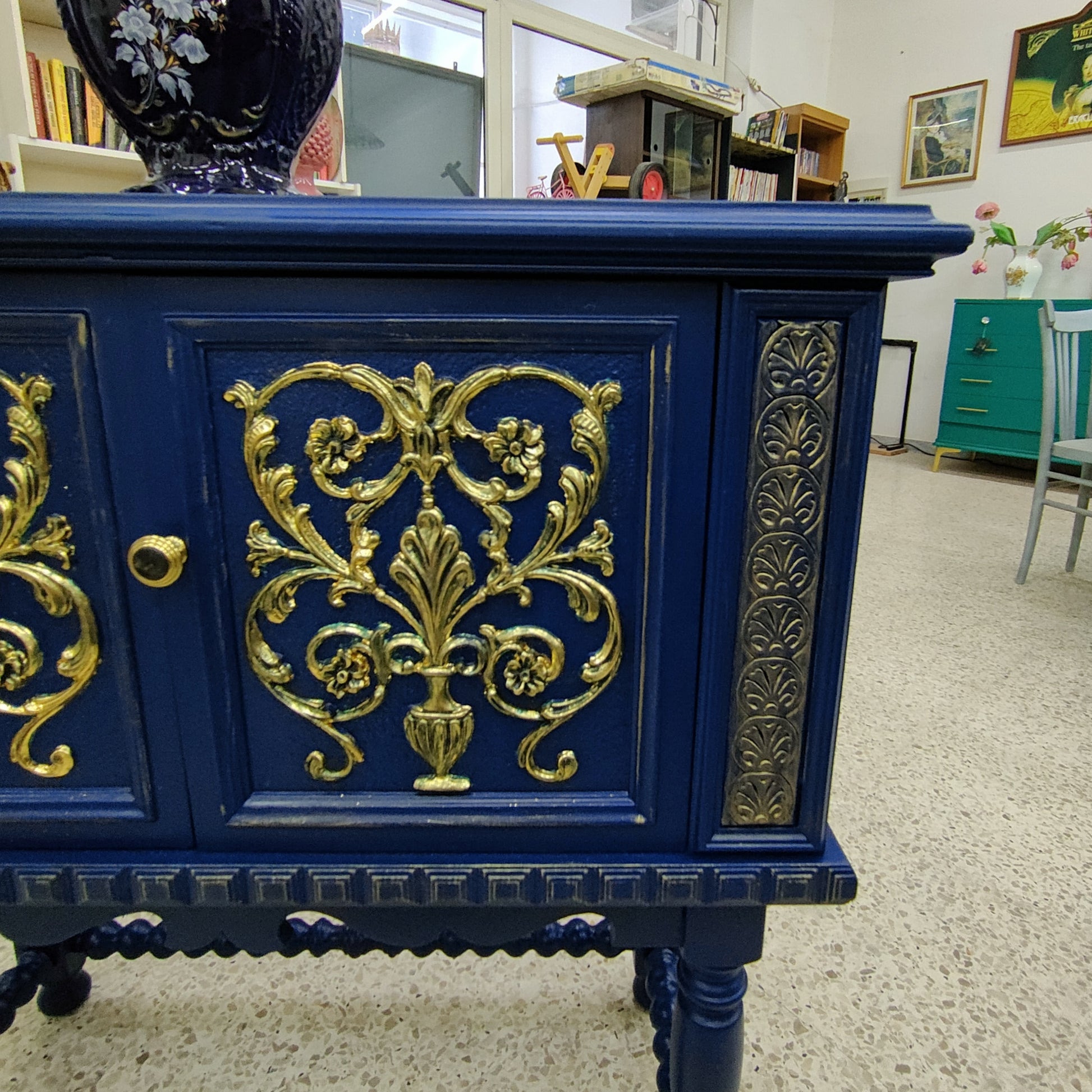 Colore : struttura Blue royal, foglia oro su sportelli e oro imbrunito nelle rifiniture.