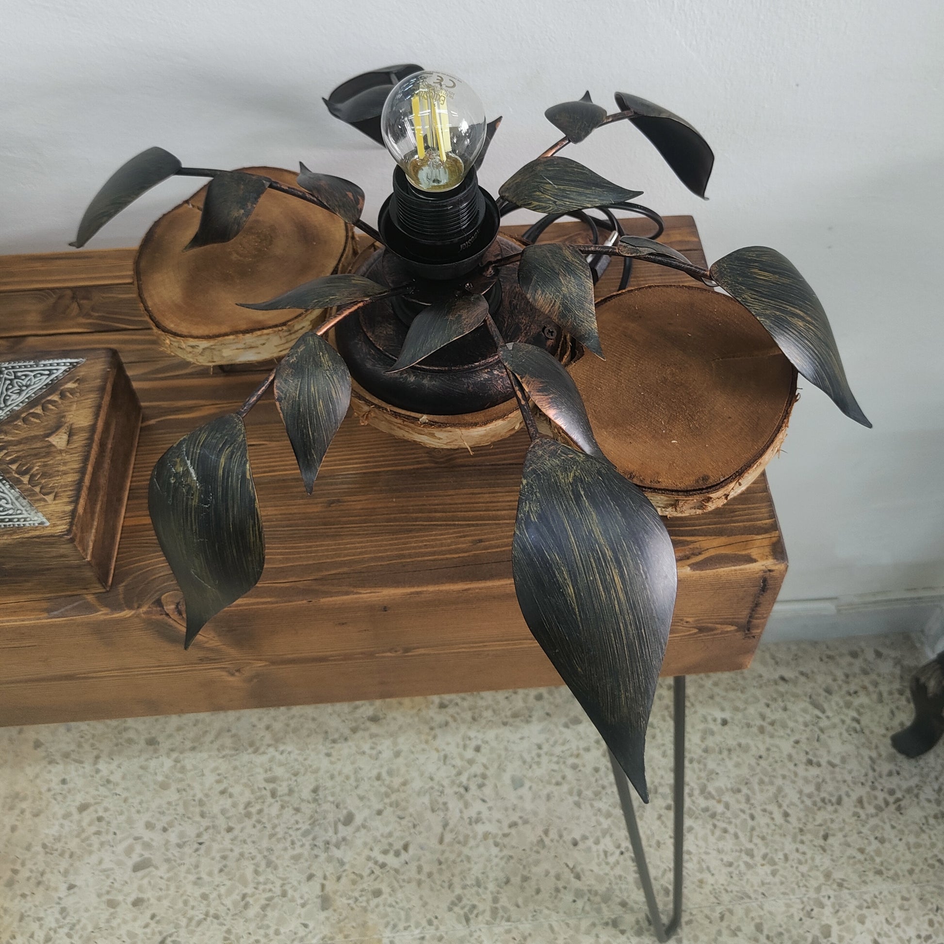 Lampada realizzata a mano con sezioni di tronco d'albero e ferro; porta lampada E27