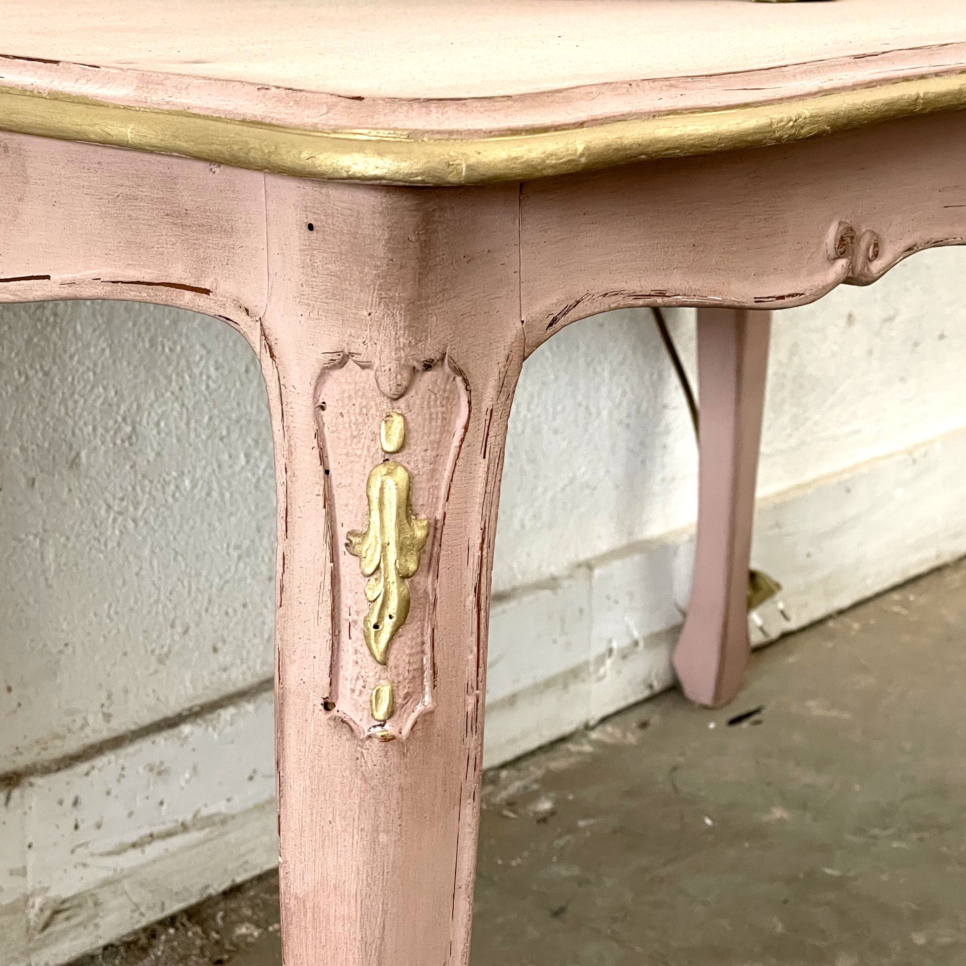 Colore rosa antico decapé e dettagli in oro imbrunito.